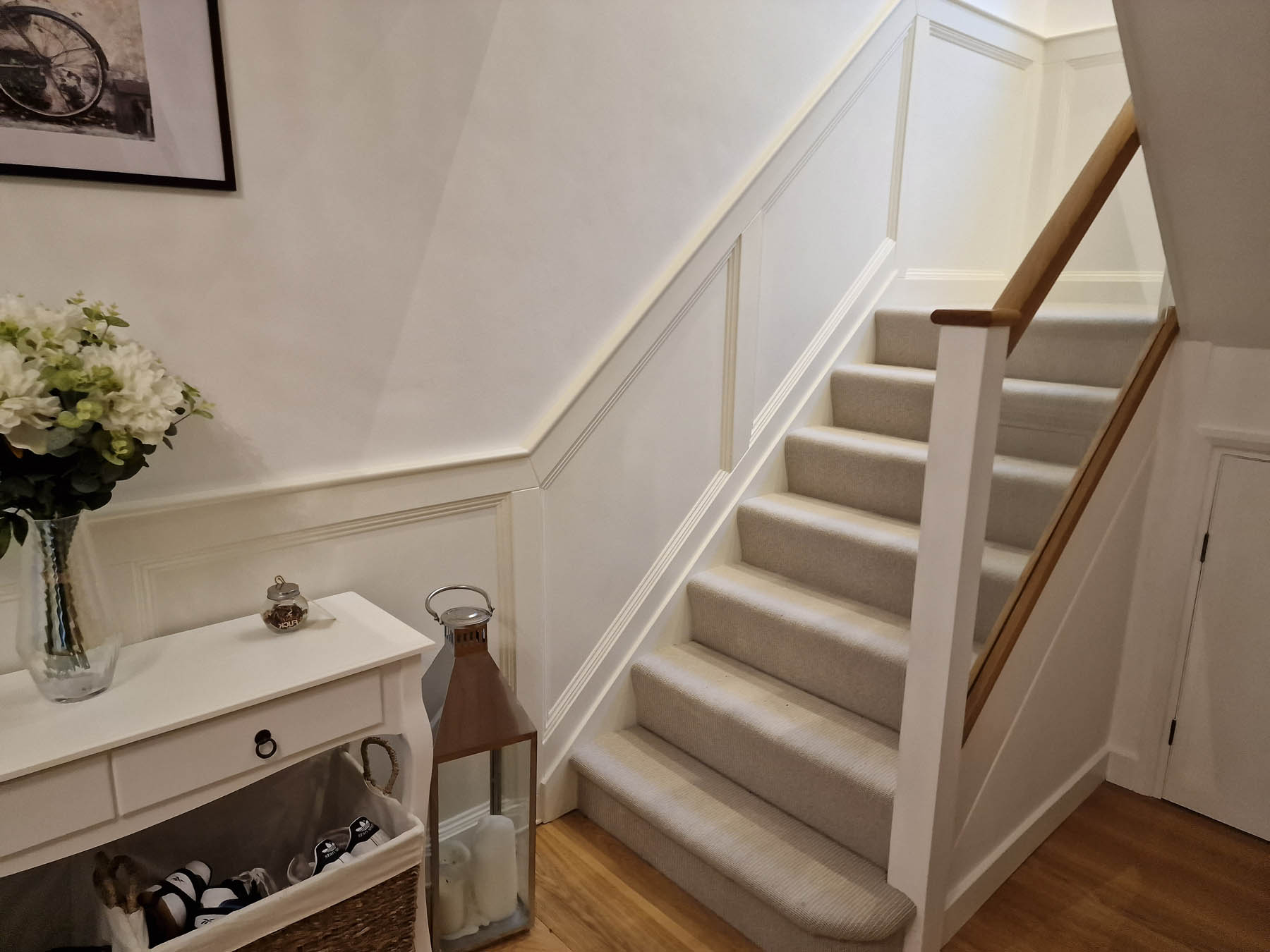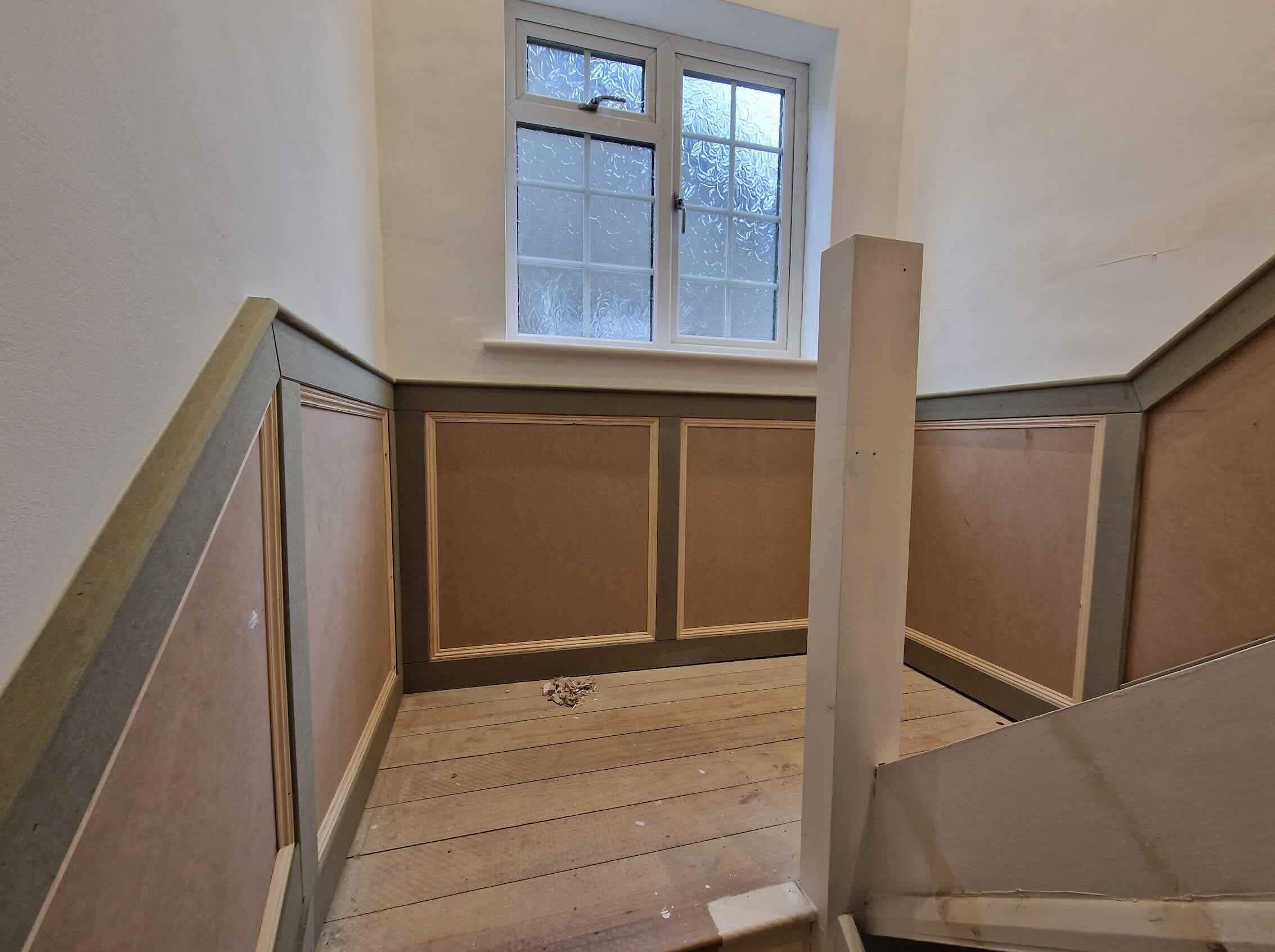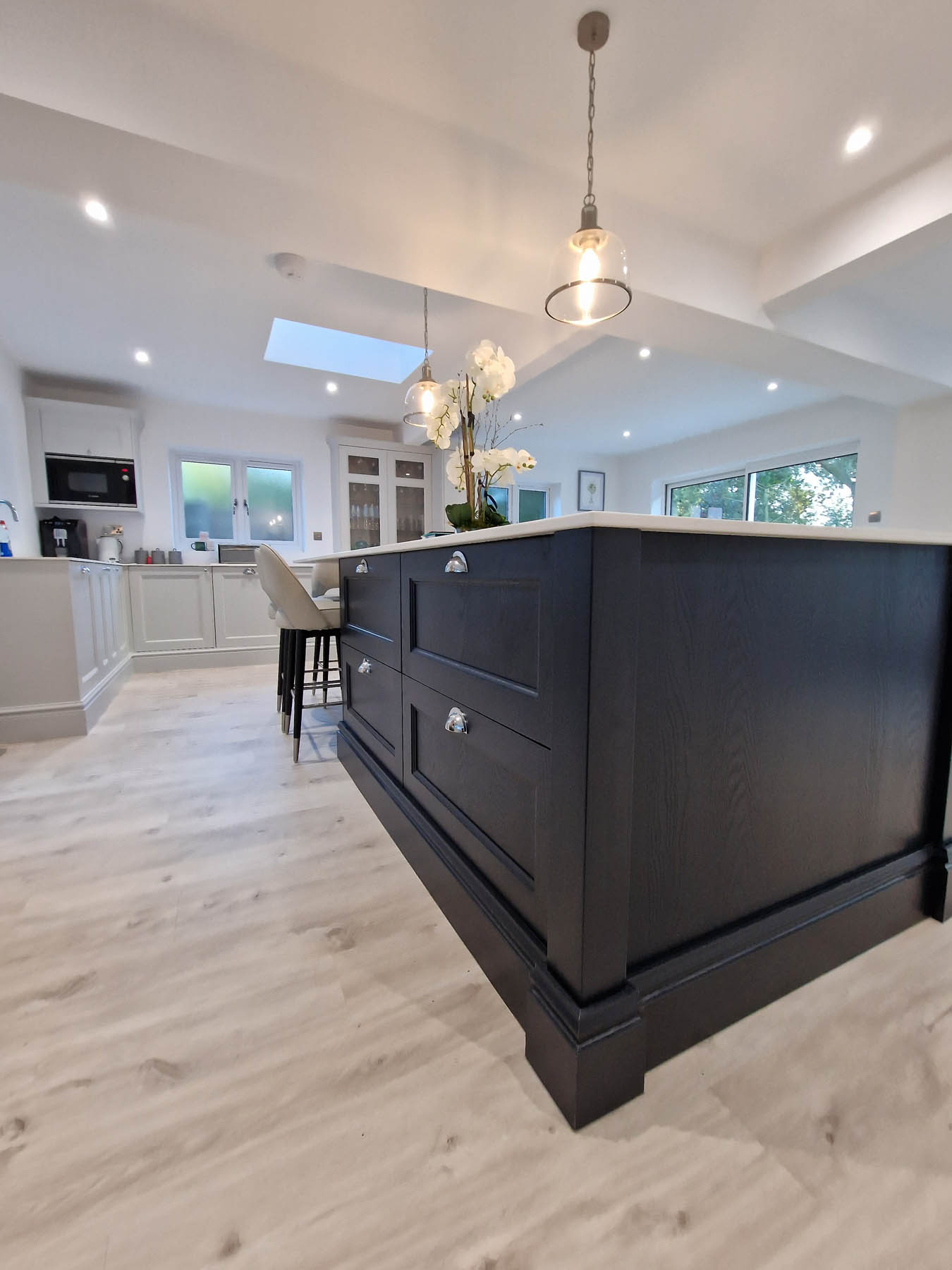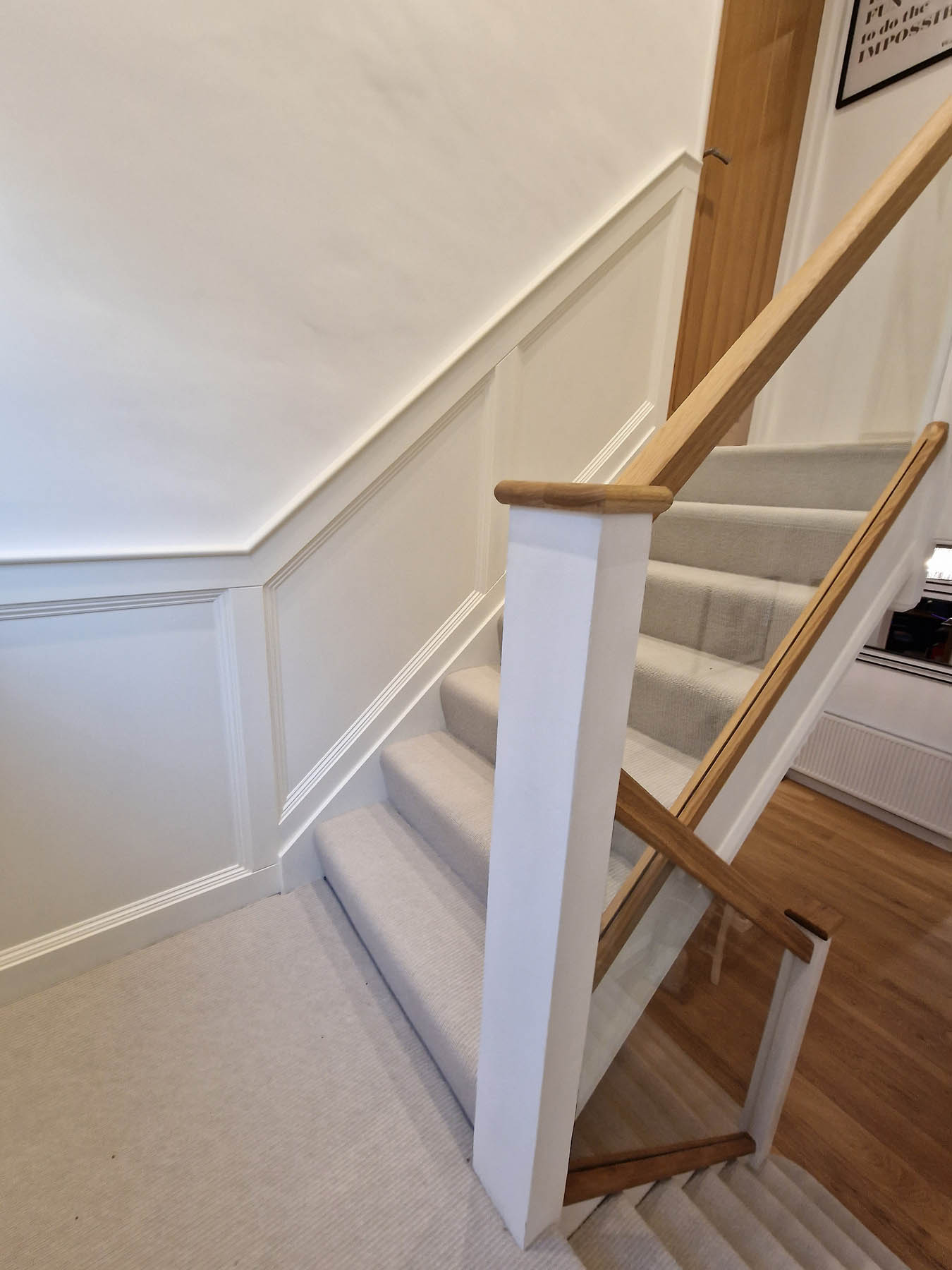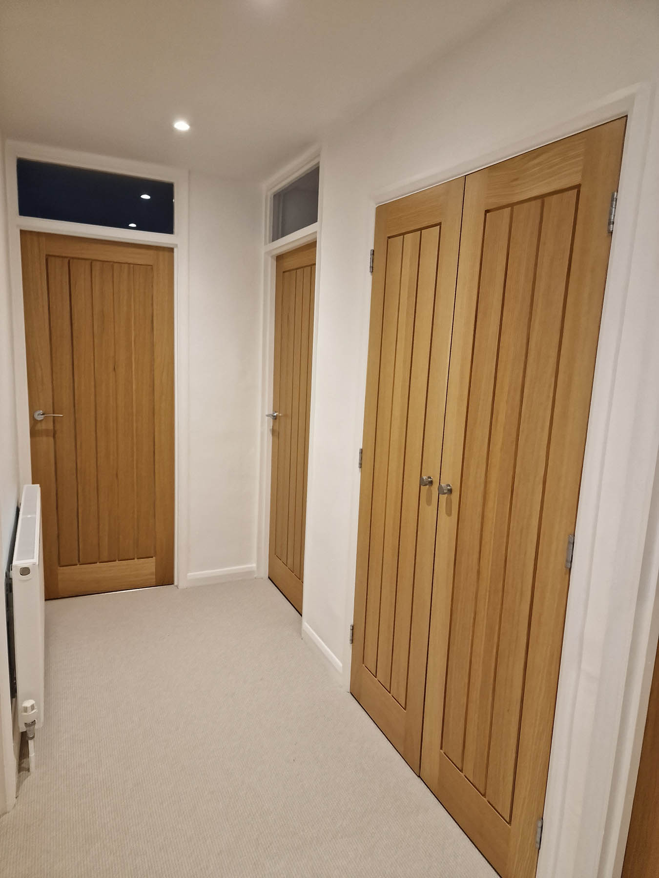 This involved a labour only fitting of a Howdens kitchen which the customer had previously designed and purchased. Also, along with some wall panelling to the stair area, the fitting of new oak stair parts and glass balustrading and lastly all new pre-finished oak doors hung throughout the property.