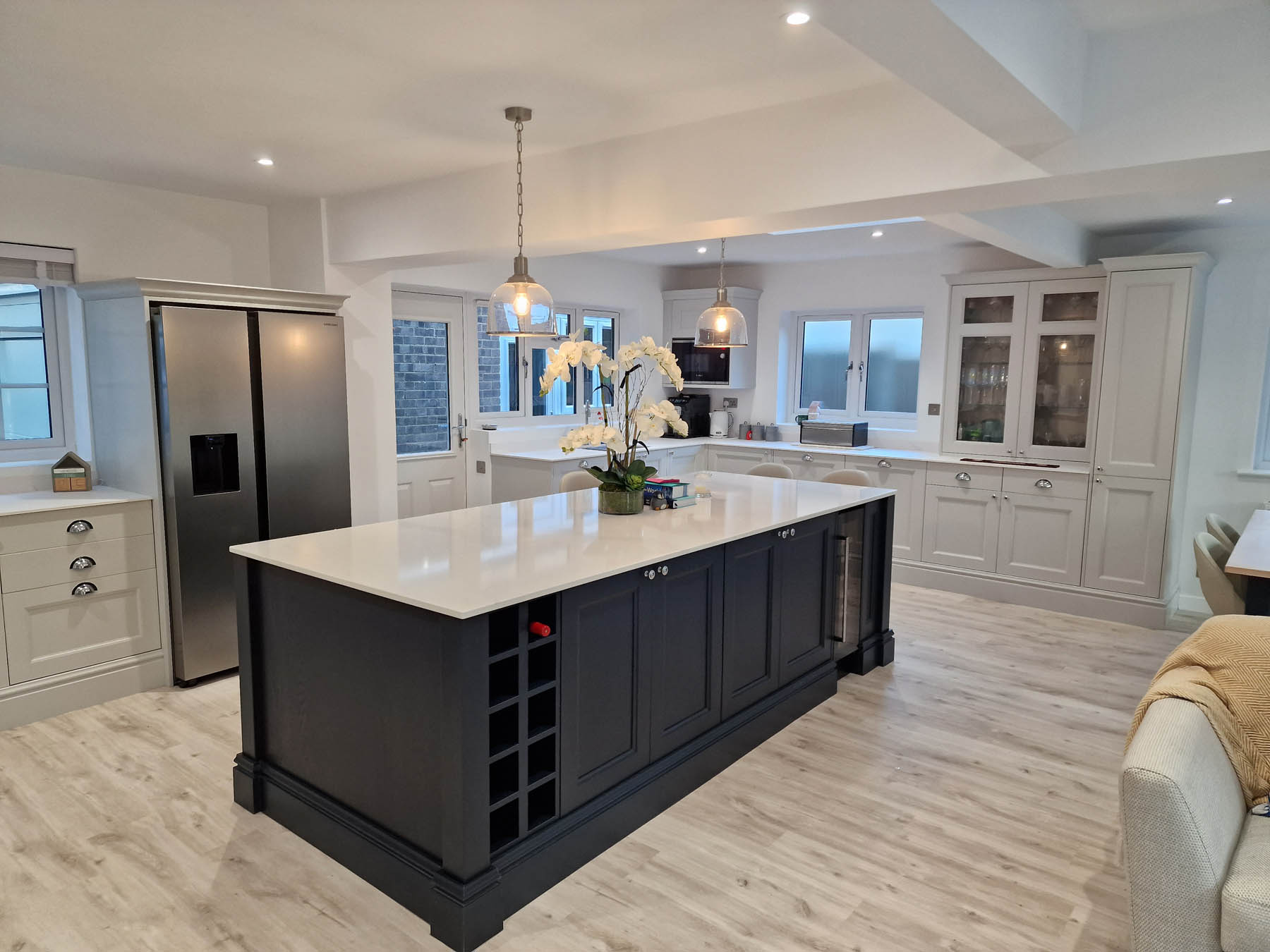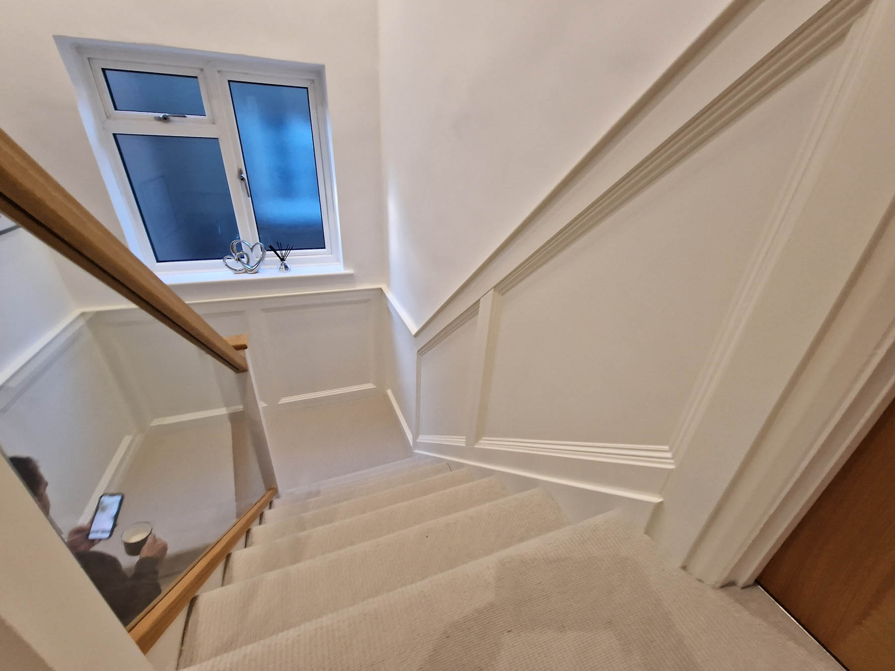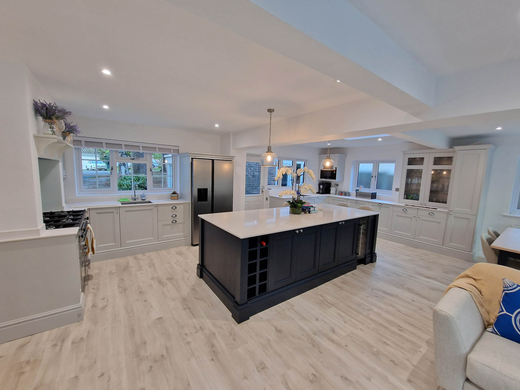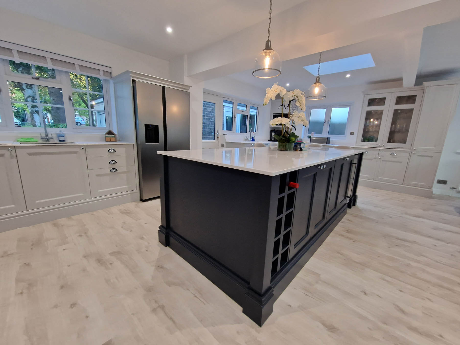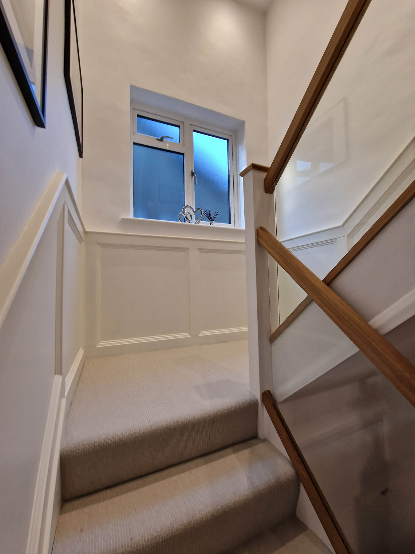 This involved a labour only fitting of a Howdens kitchen which the customer had previously designed and purchased. Also, along with some wall panelling to the stair area, the fitting of new oak stair parts and glass balustrading and lastly all new pre-finished oak doors hung throughout the property.